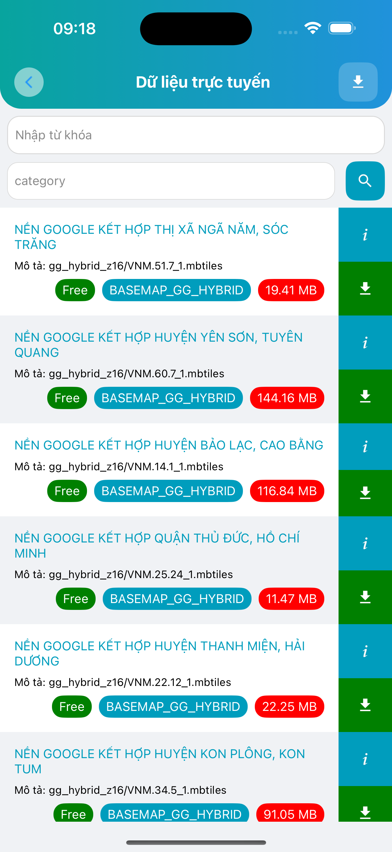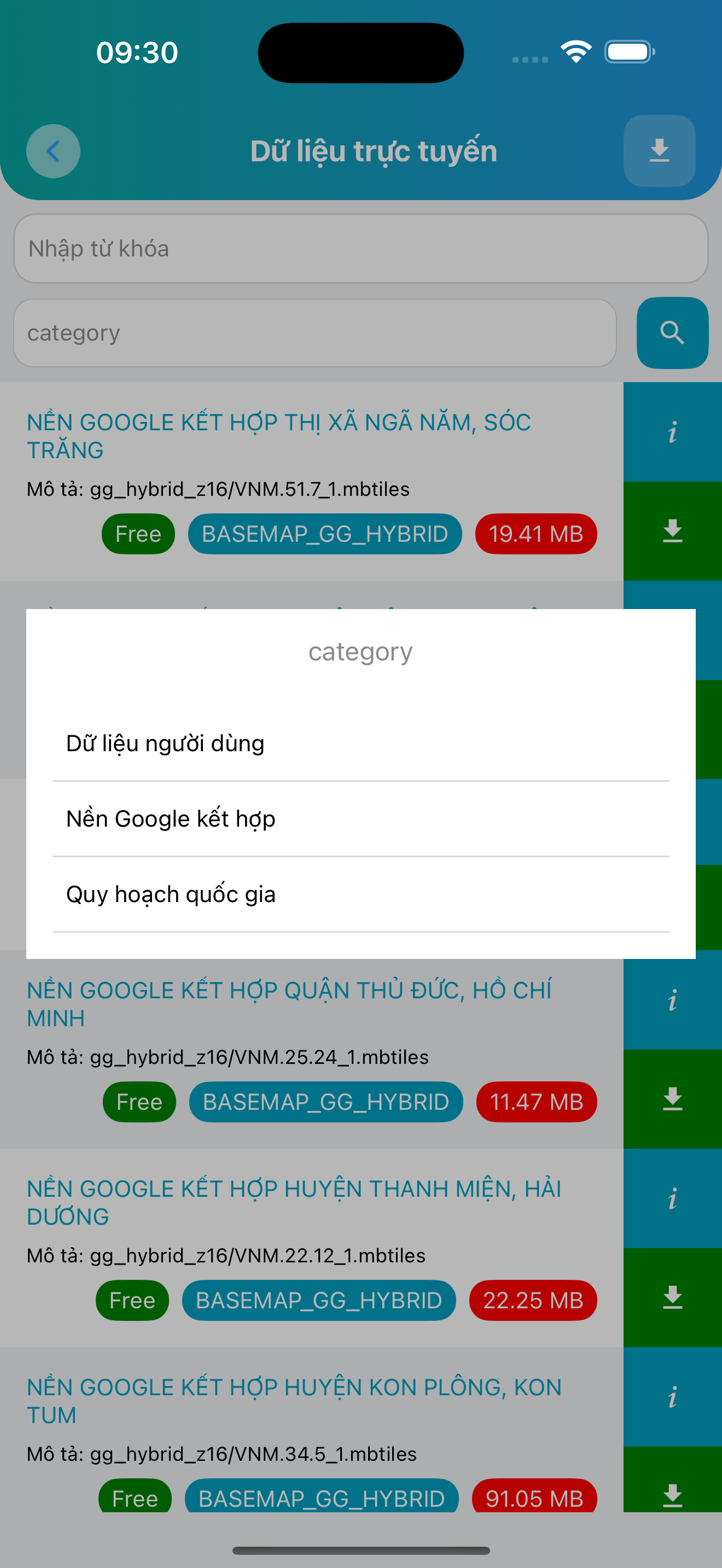 Từ đây người dùng có thể xem danh sách lớp bản đồ được chúng tôi chuẩn bị sẵn, lọc theo danh mục, xem trước thông tin, tải về để sử dụng offline.