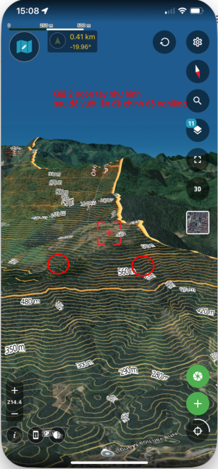 Mặc định độ nghiêng của bản đồ là 0, bạn chỉ nhìn thấy bản đồ phẳng. Bạn có thể thay đổi độ nghiêng bằng cách vuốt 2 ngón tay trên bản đồ.