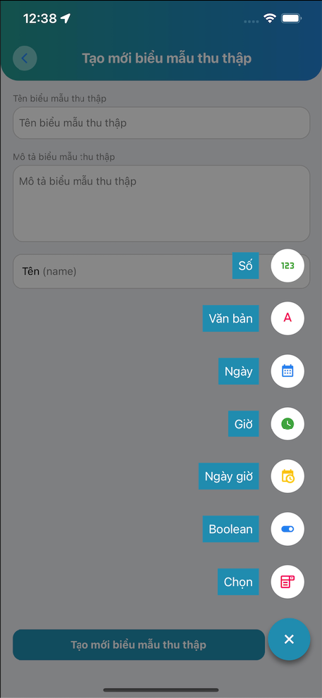 - Bước 4: Bấm dấu “+” ở góc dưới, bên phải để tạo thêm các thuộc tính của Biểu mẫu thu thập. (Chữ số, chữ, ngày, giờ,…)