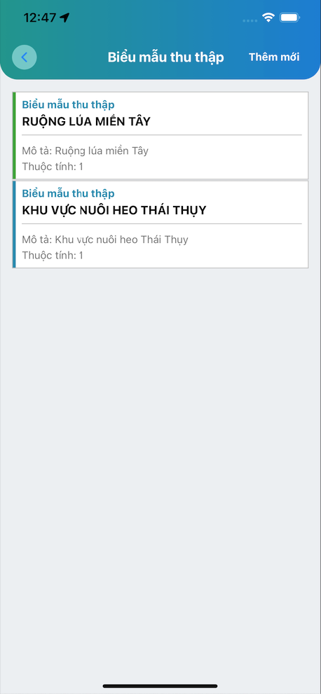 Biểu mẫu nào đang được áp dụng sẽ có màu xanh lá cây, như hình trên thì biểu mẫu Ruộng lúa miền Tây đang được áp dụng để thu thập dữ liệu.