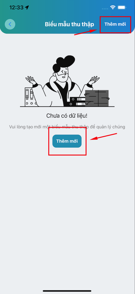 Để tạo biểu mẫu thu thập mới, vui lòng chọn Menu chính > Biểu mẫu thu thập > Thêm mới