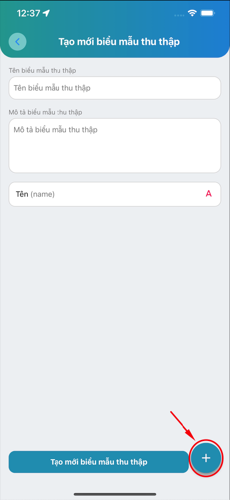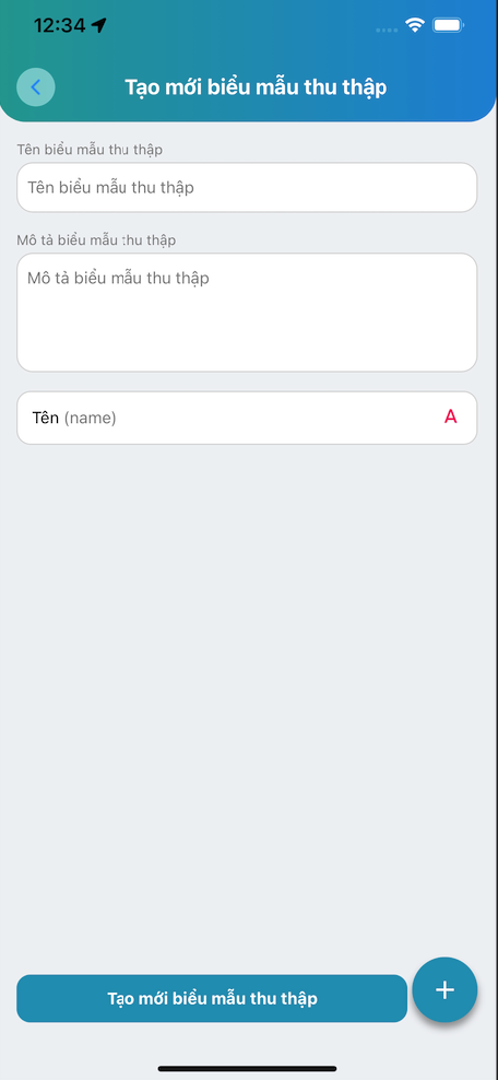 - Bước 4: Bấm dấu “+” ở góc dưới, bên phải để tạo thêm các thuộc tính của Biểu mẫu thu thập. (Chữ số, chữ, ngày, giờ,…)