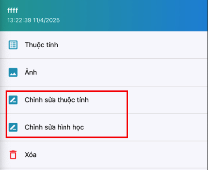 Nếu bạn muốn chỉnh sửa thông tin của 1 điểm/đường/vùng thu thập, hãy bấm vào nó trên bản đồ, và chọn Chỉnh sửa thuộc tính hoặc Chỉnh sửa hình học.