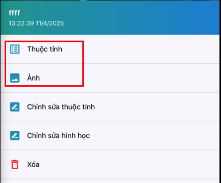 Nếu bạn muốn xem lại thông tin của 1 điểm/đường/vùng thu thập, hãy bấm vào nó trên bản đồ, và chọn Thuộc tính hoặc Ảnh.